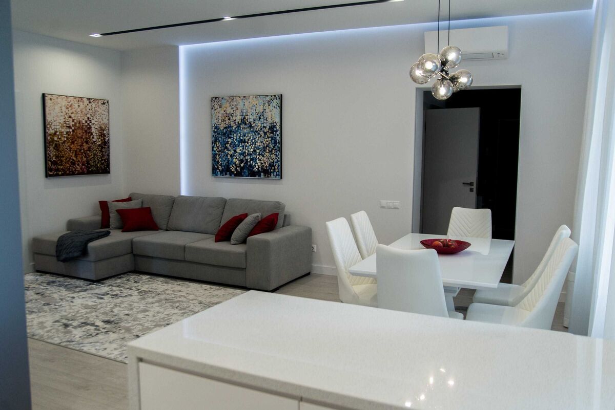 - кухня вітальня 56м2 (індукційна плита, дихова шафа, мікрохвильова піч, посудомийка, витяжка, холодильник (вся побутова техніка нова, від виробника SIEMENS), фільтр на воду, подрібнювач їжі, тепла підлога)