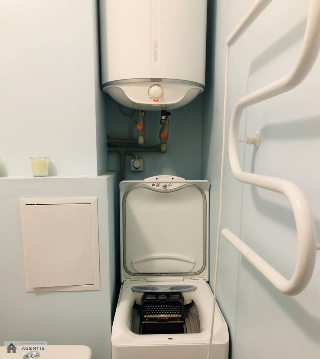 Ванна кімната з великим бойлером, пральна машина та ванна.